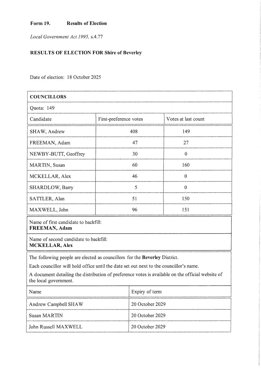 The Returning Officer is appointed by the WAEC and is responsible for managing the local government election. The Returning Officer for the 2025 ordinary elections is Natalie Ashworth who can be contacted via phone 0400 192 107.